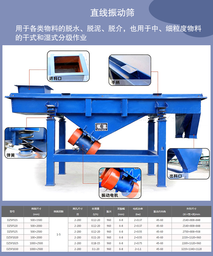較常用的振動篩包括旋振篩和直線振動篩,我廠的振動篩產品也以這兩種為主。旋振篩也叫三次元振動篩分過濾機,通過振動電機的帶動設備在運作讓物料在篩面形成一個三次元的運動,以達到篩分的目的。一般地,旋振篩的型號是根據其直徑命名,如600mm直徑就叫600旋振篩篩,800mm直徑就叫800型號旋振篩,正常的旋振篩的層數分為一層兩層三層,旋振篩篩主要用于各粒度物料的分級,。它工作可靠,篩分效率較高,篩分精度較細。我廠生產的DH型,屬于這種振動篩。