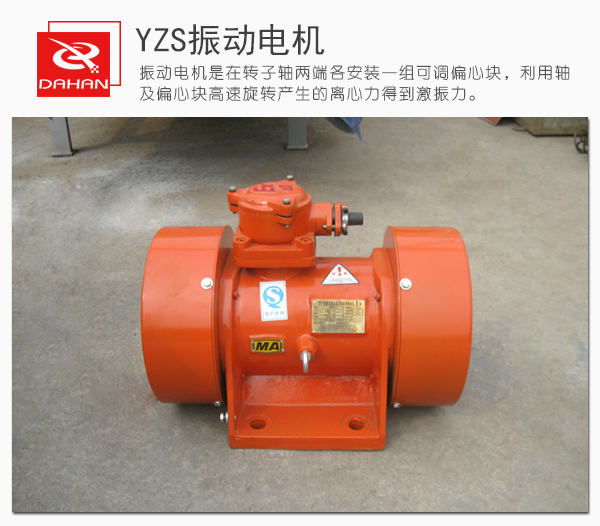 YZS振動電機是動力源與振動源結合為一體的激振源,振動電機是在轉子軸兩端各安裝一組可調偏心塊,利用軸及偏心塊高速旋轉產生的離心力得到激振力。