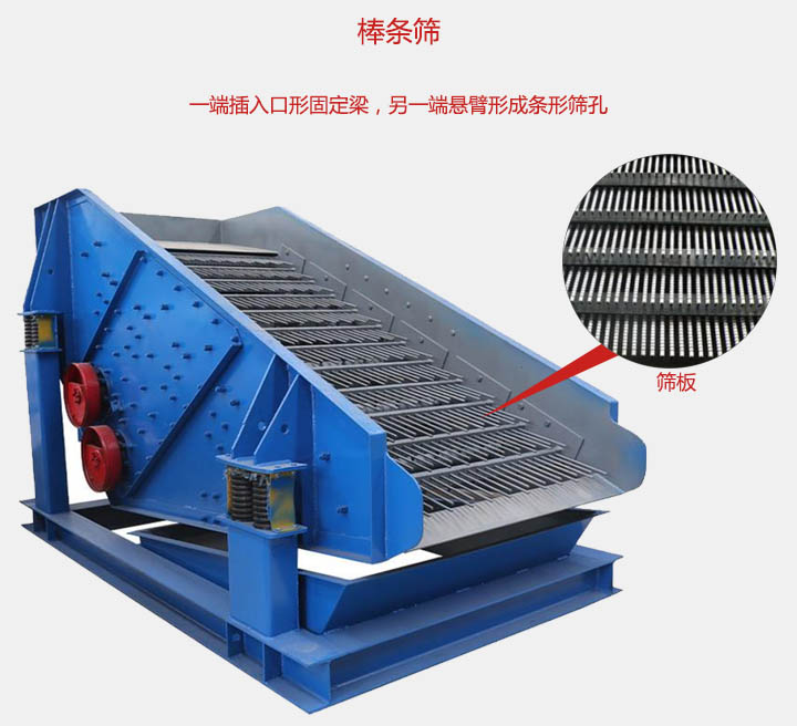 棒條篩篩面是由一組相互平行的彈簧棒條和安裝棒條的固定梁等組成的,鋼棒采用65Mn,55CrSi,60SiMn等彈簧鋼,一段插入口形固定梁,另一端懸臂形成條形篩孔,棒條的長度設計在220-360mm之間。該設備主要適用于破碎機前大塊物料的均勻給料,以及垃圾的篩分處理等行業中。