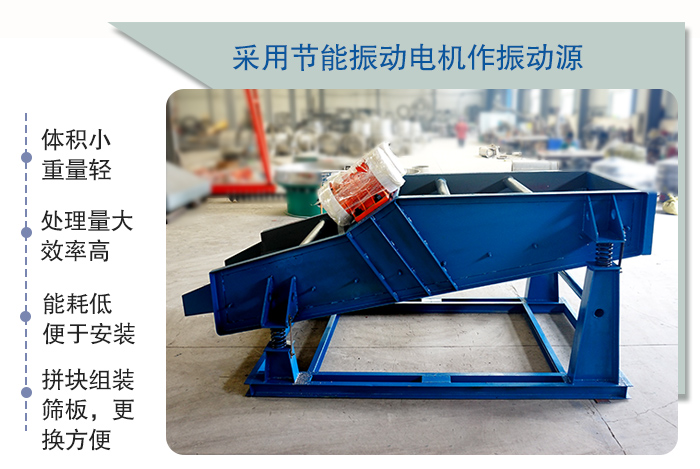該產(chǎn)品 具有體積小、重量輕,能耗低、便于安裝及工藝布置等特點(diǎn),采用振動(dòng)電機(jī)作振動(dòng)源,橡膠彈簧支撐并隔振,處理量大,篩分效率高,篩網(wǎng)有較大的安裝傾角,拼塊組裝篩板,更換方便,使用壽命長(zhǎng)。